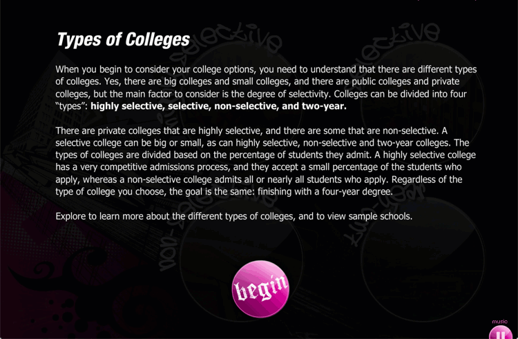 The 6 to 16 project was part of a Chicago city funded effort to target underprivileged kids to attend college. This activity is informational and utilizes rich animations that speak to kids between the ages of 6 to 16. The video is a screen capture of me playing around with the activity.